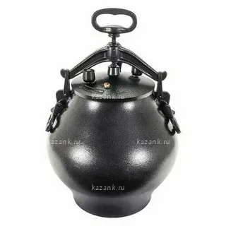 Казан Афганский-скороварка выполнен методом литья. Алюминиевый казан имеет округлую форму и может использоваться на плите и огне. Казан покрыт термокраской. Крышка надежно фиксируется прижимным устройством и имеет два рабочих клапана и один резервный. Под крышкой стоит уплотнительная резинка.