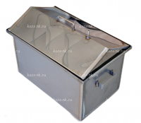 Коптильня горячего копчения из нержавеющей стали толщиной 1.5 мм(и крышка) с небольшими габаритными размерами исключает термодеформацию(кручение). Гидрозатвор придает дополнительной жесткости и позволяет коптить дома. С крышкой-домиком вся копоть-конденсат не попадает на продукт, а стекает в желоб(гидрозатвор). Крышка имеет штуцер для отвода дыма. Внутри две решетки и поддон для сбора жира. Одну решетку можно снять и коптить более объемные продукты.