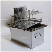 Коптильня горячего копчения из нержавеющей стали толщиной 2 мм(только чаша), крышка и гидрозатвор выполнены из стали 1мм. Небольшие габаритные размерами исключают термодеформацию(кручение). Гидрозатвор придает дополнительной жесткости и позволяет коптить дома. С крышкой-домиком вся копоть-конденсат не попадает на продукт, а стекает в желоб(гидрозатвор). Крышка имеет штуцер для отвода дыма. Внутри две решетки и поддон для сбора жира. Одну решетку можно снять и коптить более объемные продукты. Термометр позволяет готовить строго по заданной рецептуре.