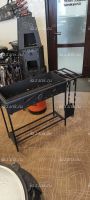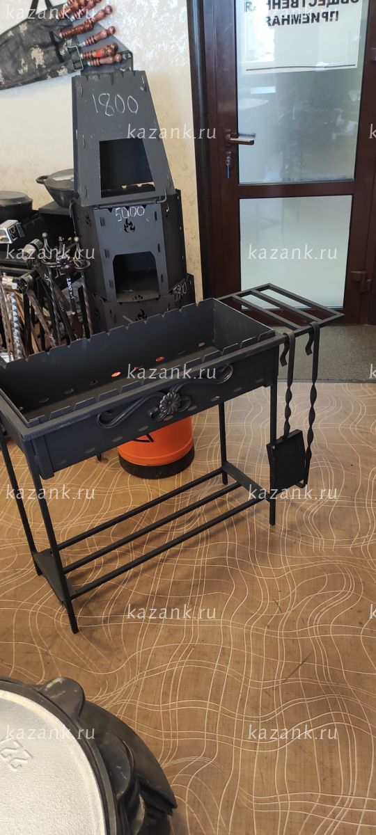 Разборный стоевой мангал с боковой полочкой. Мангал толщиной 2.2 мм по периметру усилен профилем для жесткости каркаса от термодеформации(металл не ведет). Боковую полочку удобно использовать для приготовления. Топочная имеет элементы ковки, что придает жесткости какркасу. Так же ноги между собой связаны нижней дровницей. Мангал можно доукомплектовать подказанником до 8 литров, совком с кочергой, шампурами и казаном. Мангал полностью разбирается и укладывается в камеру сгорания.Окрашен термокраской.