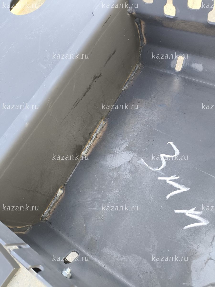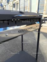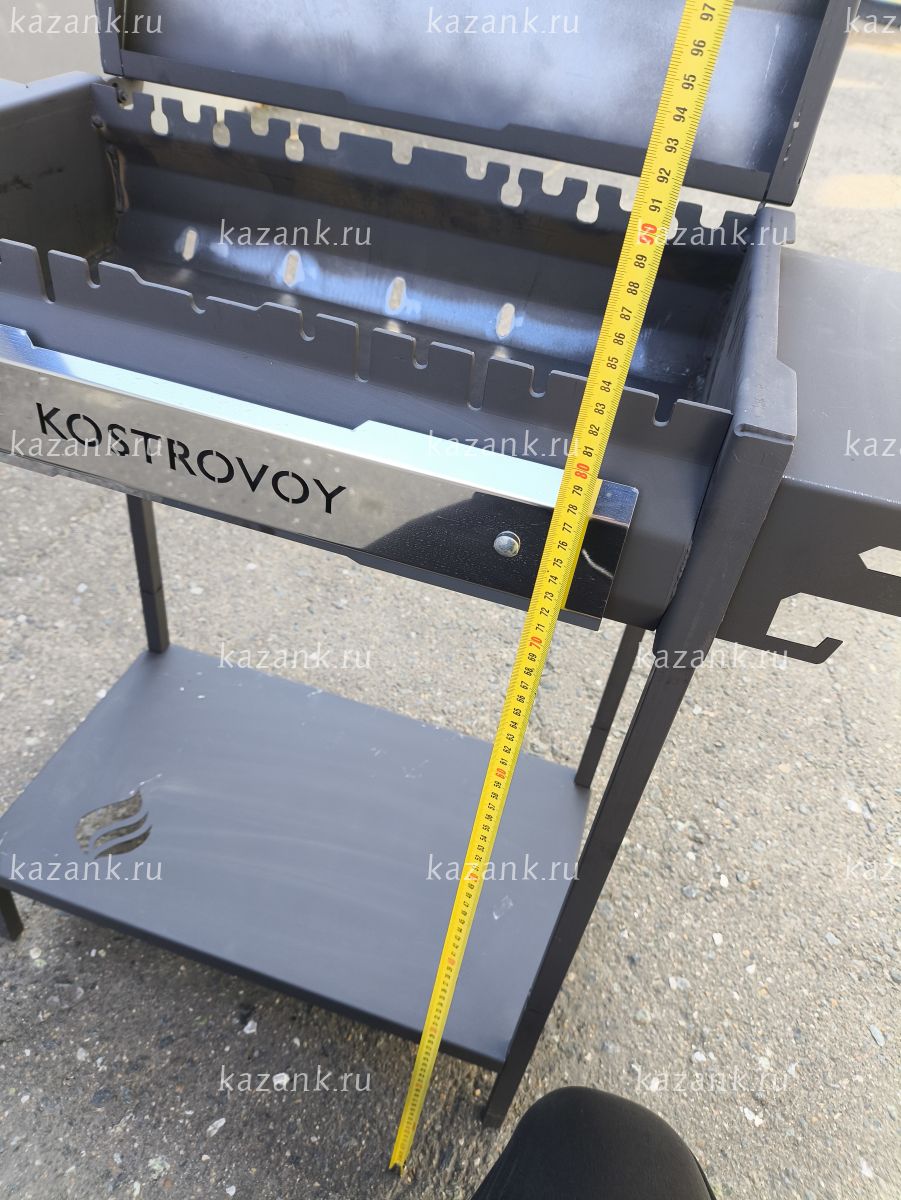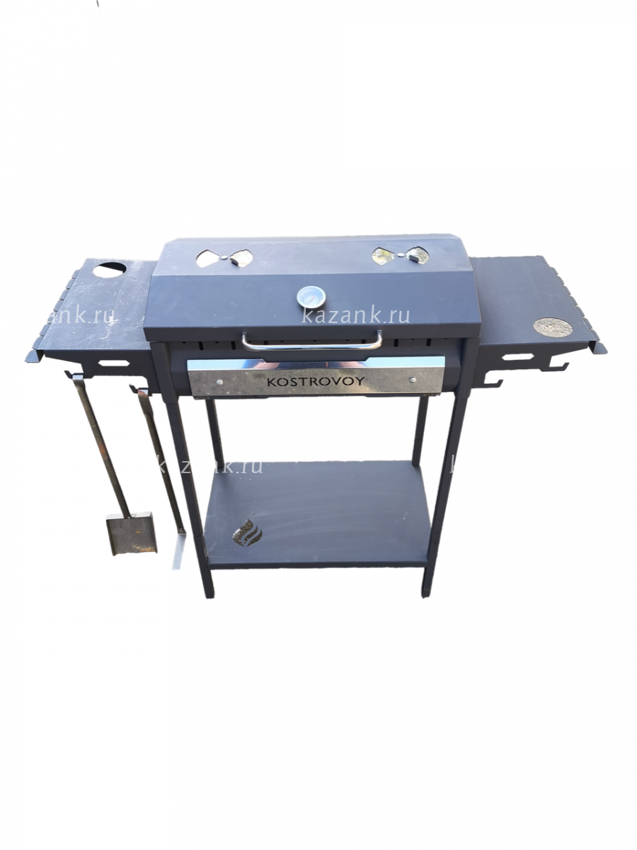 Мангал разборный "Костровой" с крышкой выполнен из стали 3мм(чаша). Полки, крышка, дровница выполнены из метала толщиной 1мм. Крышка позволяет пользоваться им как мангалом-гриль. Крышка окрашена термокраской и имеет хромированную ручку для открывания. Встроеный механический термометр не позволит вашему продукту сгореть, два регулируемых отверстия на крышке позволят регулировать жар. Мангал имеет несколько ребер жесткости на основной чаше что исключает его кручение. а термоэкран на лицевой части исключит ожог. Боковые полки позволяют повешать шампуры или другие предметы готовки, так же в полках есть подстаканники. Нижняя дровница позволит подсушить дрова.