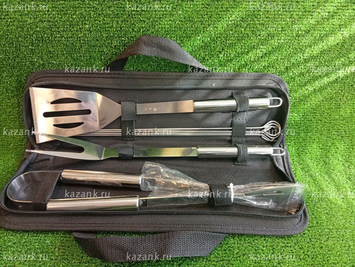 Набор  барбекю : лопатка,вилка,щипцы, 4 шампура. Сумка для хранения. Прочный материал, удобный для переноски, является хорошим помошником для вашего барбекю на открытом воздухе.