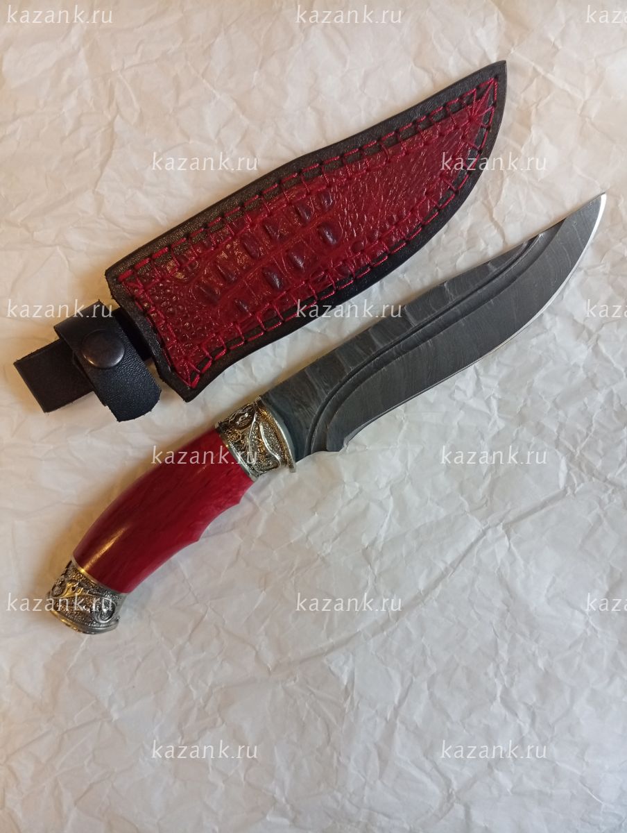 Нож Дамасск кованная сталь :в комплекте кожанные ножны и сертификат,что нож не является холожным оружием! Твердость стали 60-62 НRC; Толщина клинка 3,3мм; Рукоять карельская береза+мельхиор; Производство: Кизляр (Дагестан)
