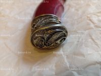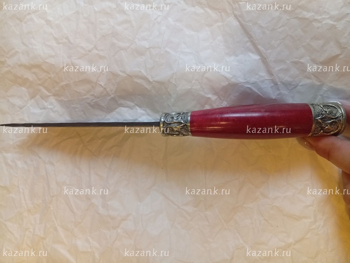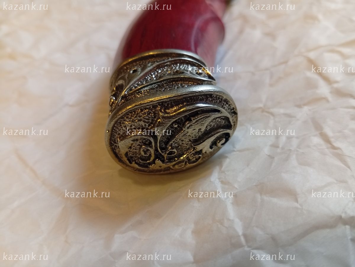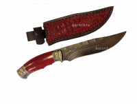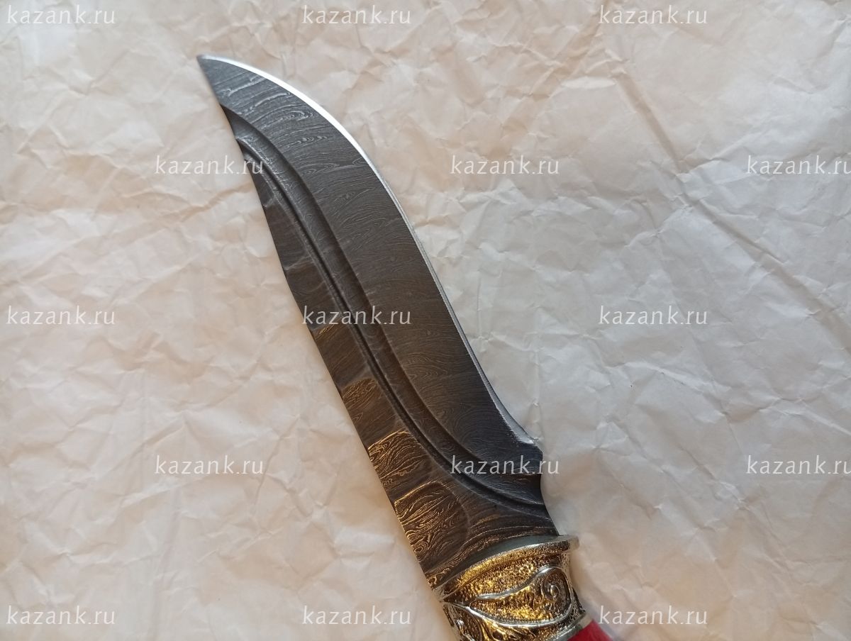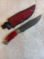 Нож Дамасск кованная сталь :в комплекте кожанные ножны и сертификат,что нож не является холожным оружием! Твердость стали 60-62 НRC; Толщина клинка 3,3мм; Рукоять карельская береза+мельхиор; Производство: Кизляр (Дагестан)