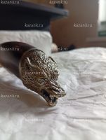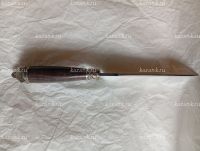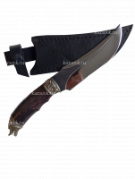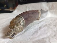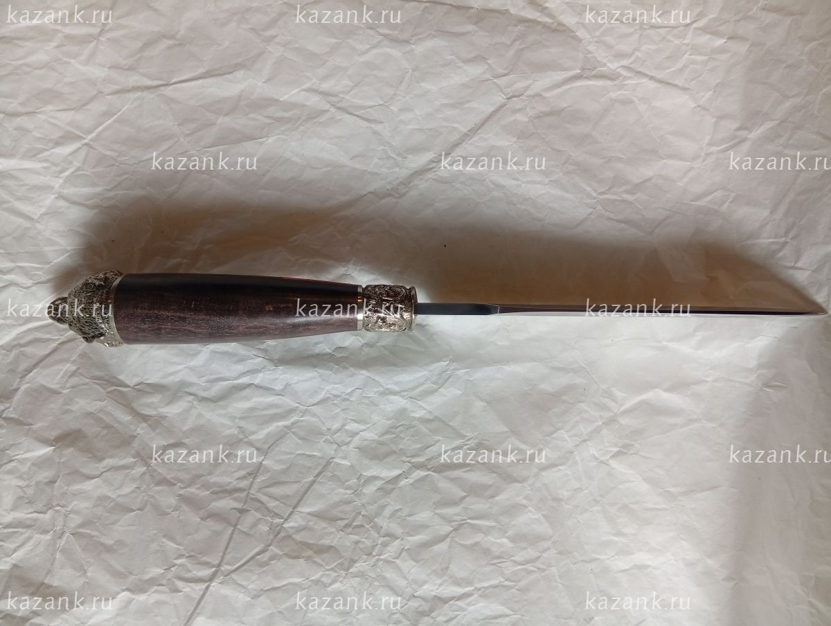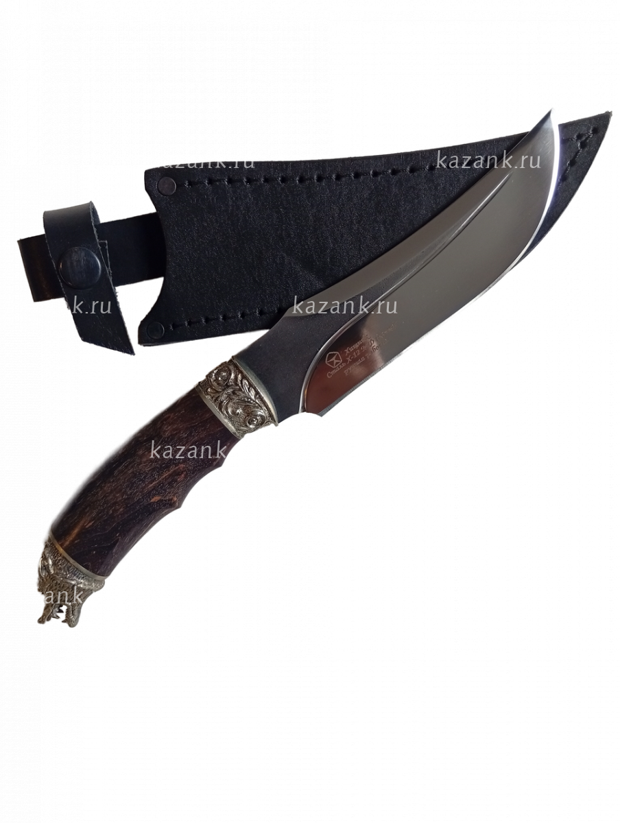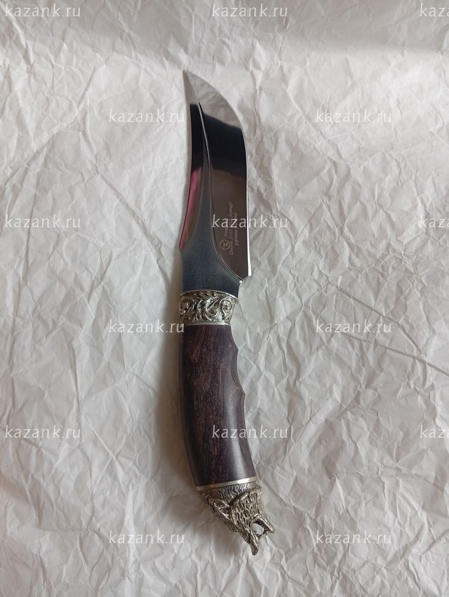 Нож Хищник сталь Х12МФ кованый, ручная работа; Рукоять литье голова волка+венга; Общая длина 285 мм; Длина клинка 152 мм; Ширина клинка 34мм;Толщина клинка 4 мм; Длина рукоятки 140 мм; Твердость клинка 61 HRC. В комплекте идет  сертификат и кожанные ножны.