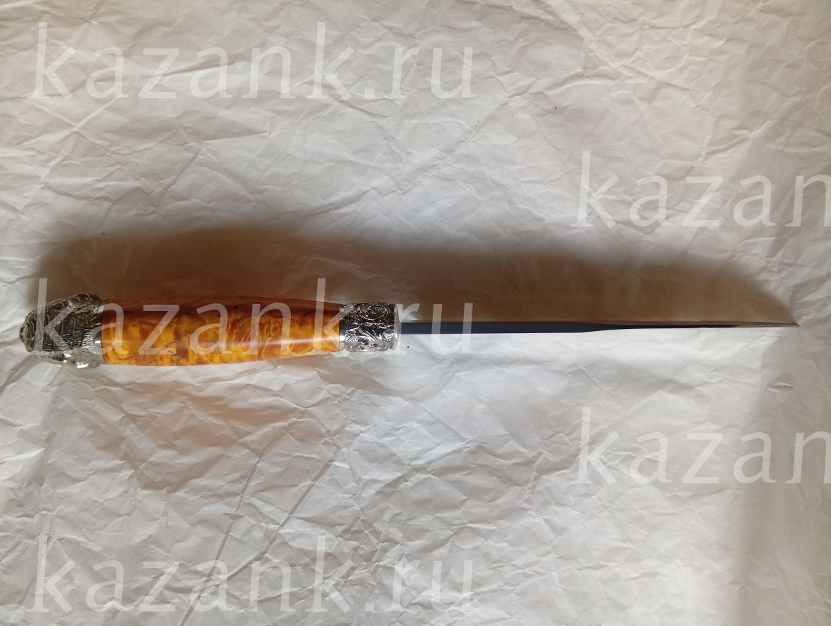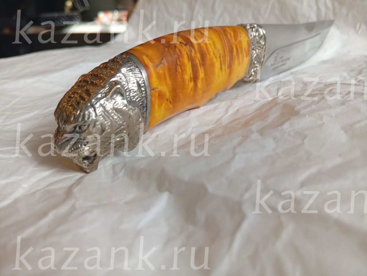 Нож Зверь сталь Х12мф кованый, ручная работа; Рукоять литье голова тигра+корелка; Общая длина 283 мм; Длина клинка 155 мм; Ширина клинка 34мм;Толщина клинка 4 мм; Длина рукоятки 128 мм; Твердость клинка 60-62 HRC. В комплекте идет  сертификат и кожанные ножны.