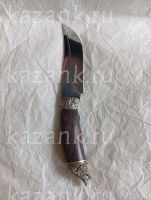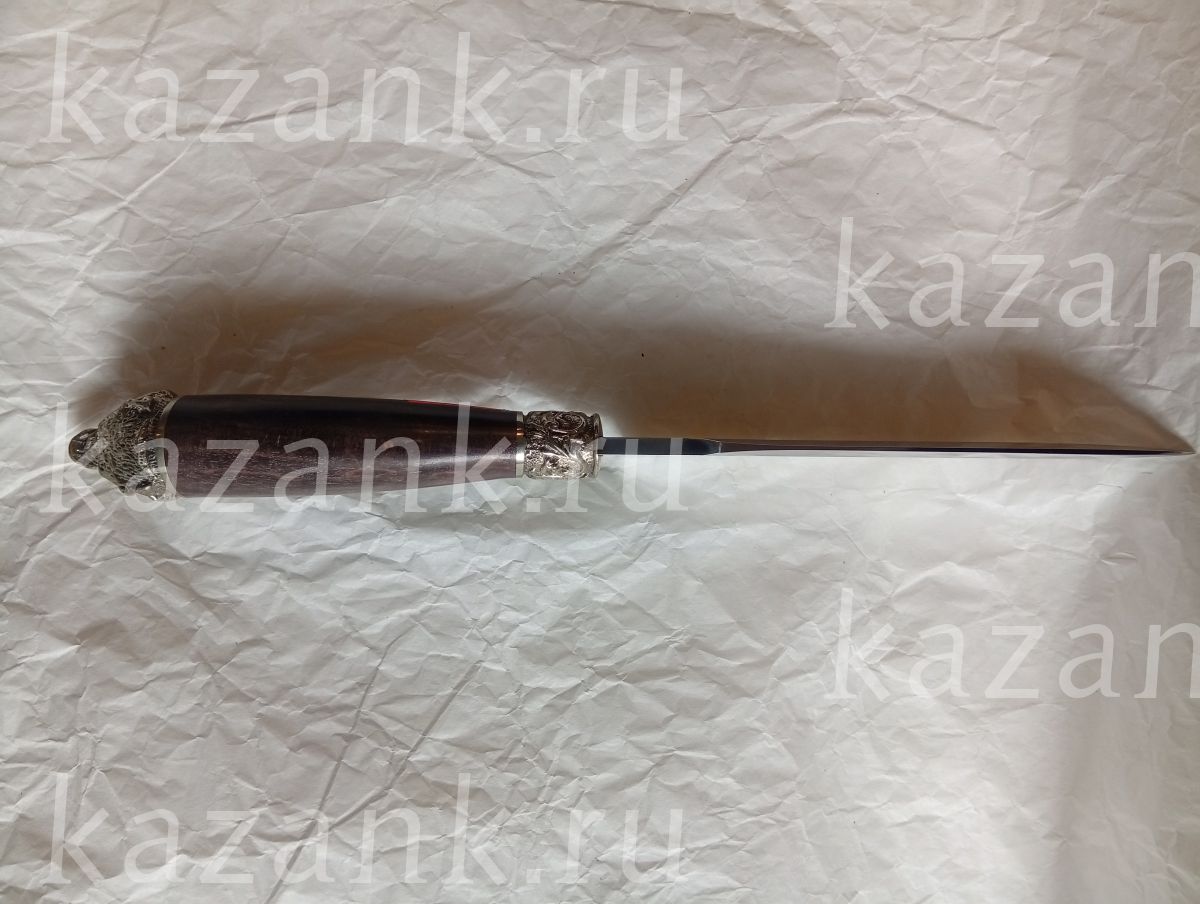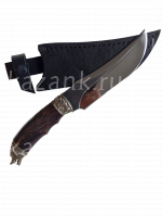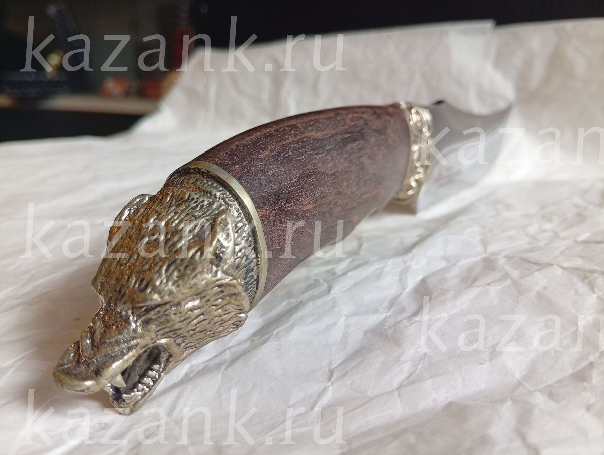 Нож Хищник сталь Х12МФ кованый, ручная работа; Рукоять литье голова волка+венга; Общая длина 285 мм; Длина клинка 152 мм; Ширина клинка 34мм;Толщина клинка 4 мм; Длина рукоятки 140 мм; Твердость клинка 61 HRC. В комплекте идет  сертификат и кожанные ножны.