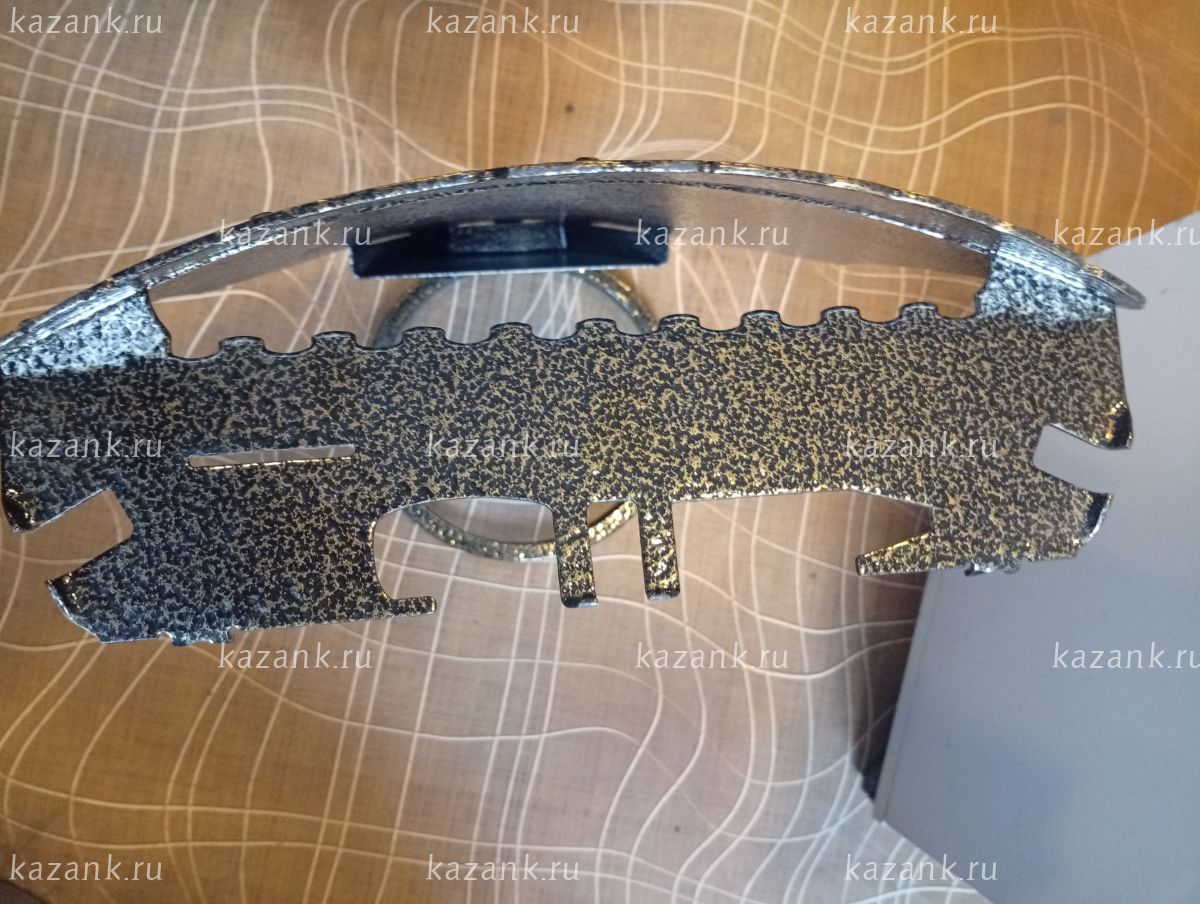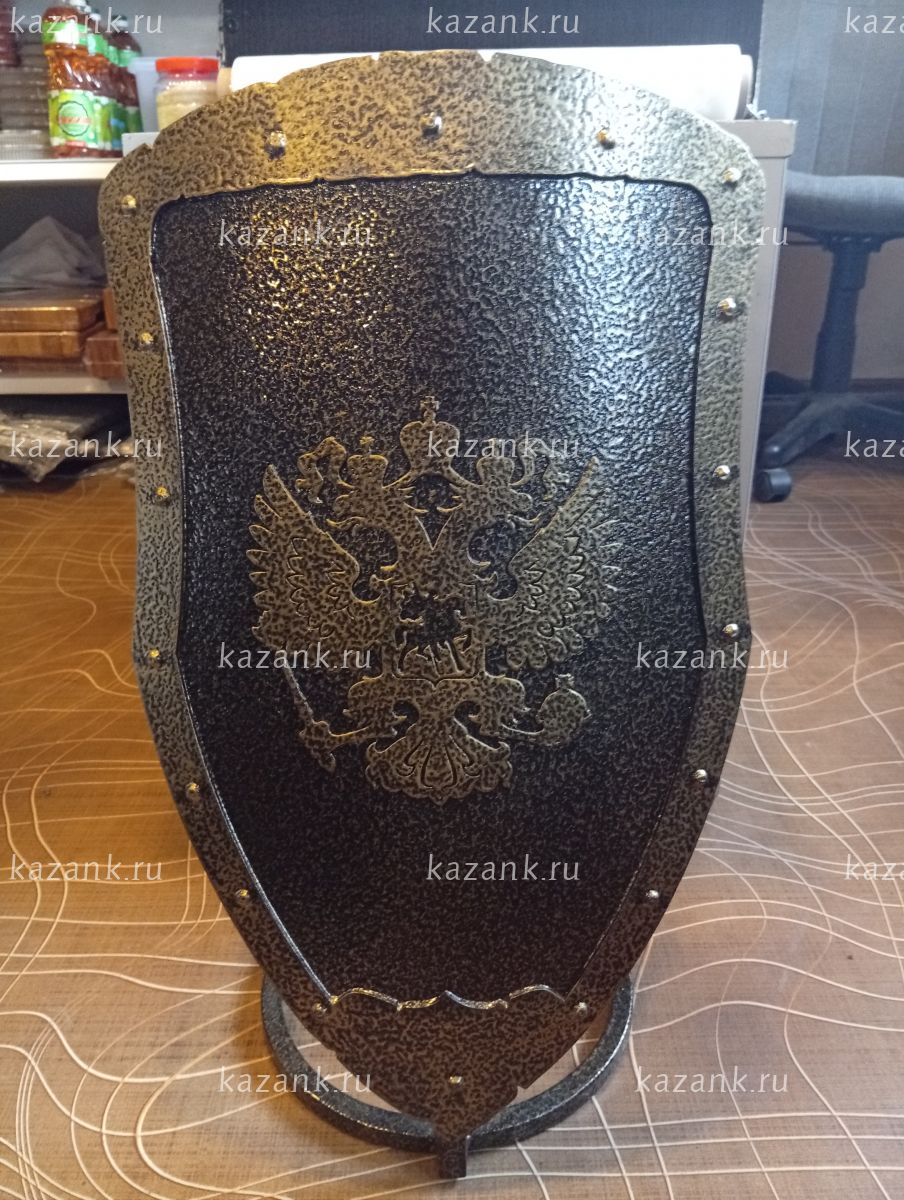 Подставка для шампуров и аксессуаров для мангала и камина в виде рыцарского щита с эмблемой: герб России. Изготовлены из металла, покрыты черной краской и золотистой платиной.