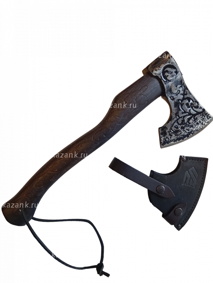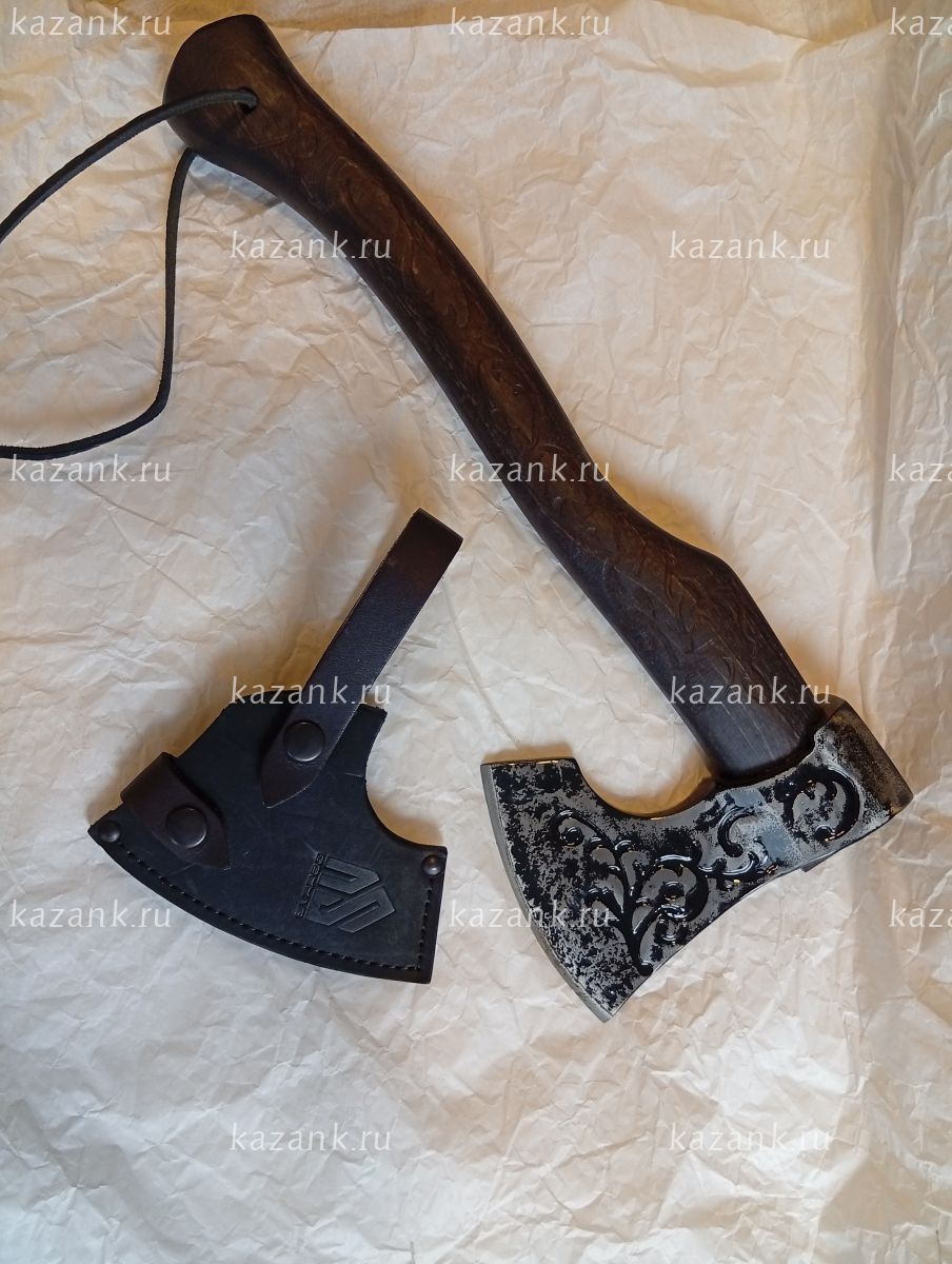 Топор Русичь сталь 60Г, рукоять орех с художественной резьбой. Голова топора покрыта специальным порошковым лаком. Общая длина 41 см, длина лезвия 11,8см , ширина клинка 15,5см. Топор удобен в рубке кустарников, колке дров. Удобная форма рукояти обеспечивает возможность выбрать самое удобное положение для вашей руки.